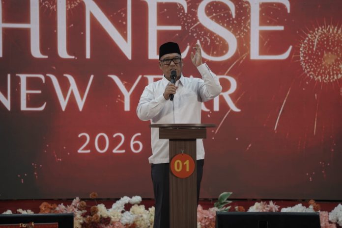 FOTO : Wagub Kepri Nynyang Haris Pratamura menyampaikan kata Perayaan pada perayaan Cap Go Meh 2026/2577 Kongzili yang digelar di Vihara Samudra Bhakti, Pulau Buluh, Kota Batam