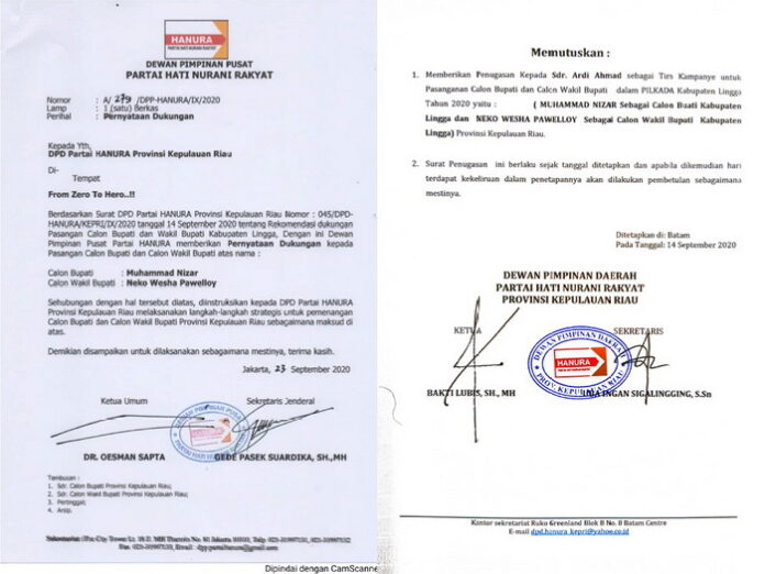 Menurut Plt. Ketua Partai Hanura Kabupaten Lingga, Ardi Ahmad rekomendasi partai Hanura langsung diberikan oleh Dewan Pimpinan Pusat (DPP) Partai Hanura jauh-jauh hari sebelum pendaftaran ke KPU Kabupaten Lingga, Partai Hanura secara sah dan legal mendukung pasangan nomor urut tiga Muhammad Nizar – Neko Wesha Pawelloy.