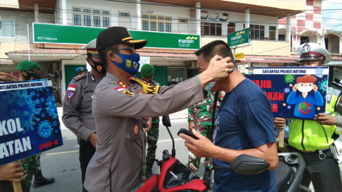 Selain melaksanakan giat razia, Kapolres Natuna AKBP Ike Krisnadian, S.I.K., M.Si mengatakan bahwa anggota yang bertugas juga memberikan himbauan protokol kesehatan tentang penerapan 3 M dengan menggunakan papan peraga dan juga membagikan masker kepada pengendara kendaraan bermotor.