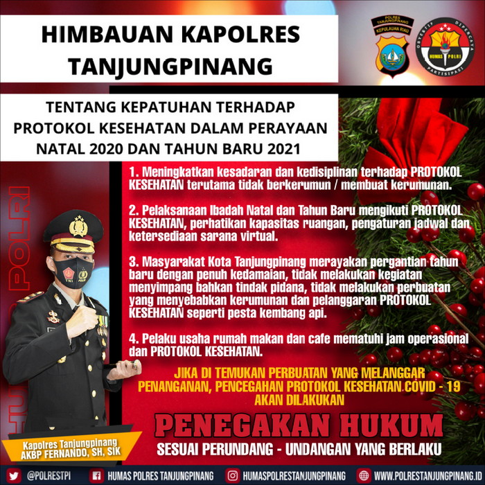 Bursakota.co.id, Tanjungpinang – Menjelang Perayaan Natal 2020 dan Tahun Baru 2021 Kapolres Tanjungpinang AKBP Fernando, S.H, S.I.K., mengeluarkan Himbauan Kapolres Tanjungpinang tentang Kepatuhan Terhadap Protokol Kesehatan Dalam Perayaan Natal 2020 dan Tahun Baru 2021.