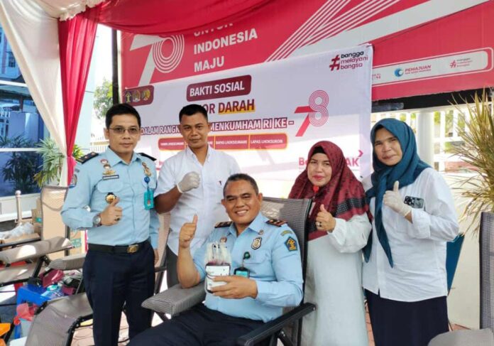 Bursakota.co.id, Lhokseumawe – Imigrasi Kelas II TPI Lhokseumawe, Lapas Kelas IIA Lhokseumawe, Lapas Kelas IIB Lhoksukon dan Bapas Kelas II Lhokseumawe menggelar bakti sosial donor darah dalam rangka menyemarakkan hari ulang tahun (HUT) ke 78 Kementerian Hukum dan HAM (Kemenkumham) RI.