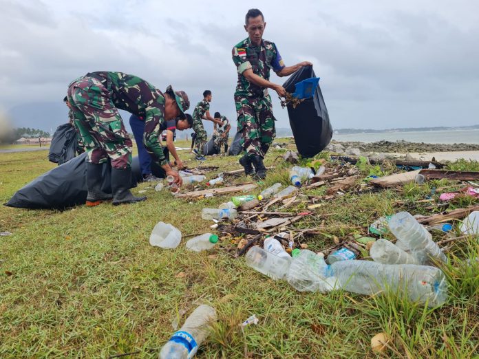 Setelah apel pagi, anggota Lanud RSA bahu-membahu membersihkan sampah plastik di Pantai Ujung Runway Lanud RSA.