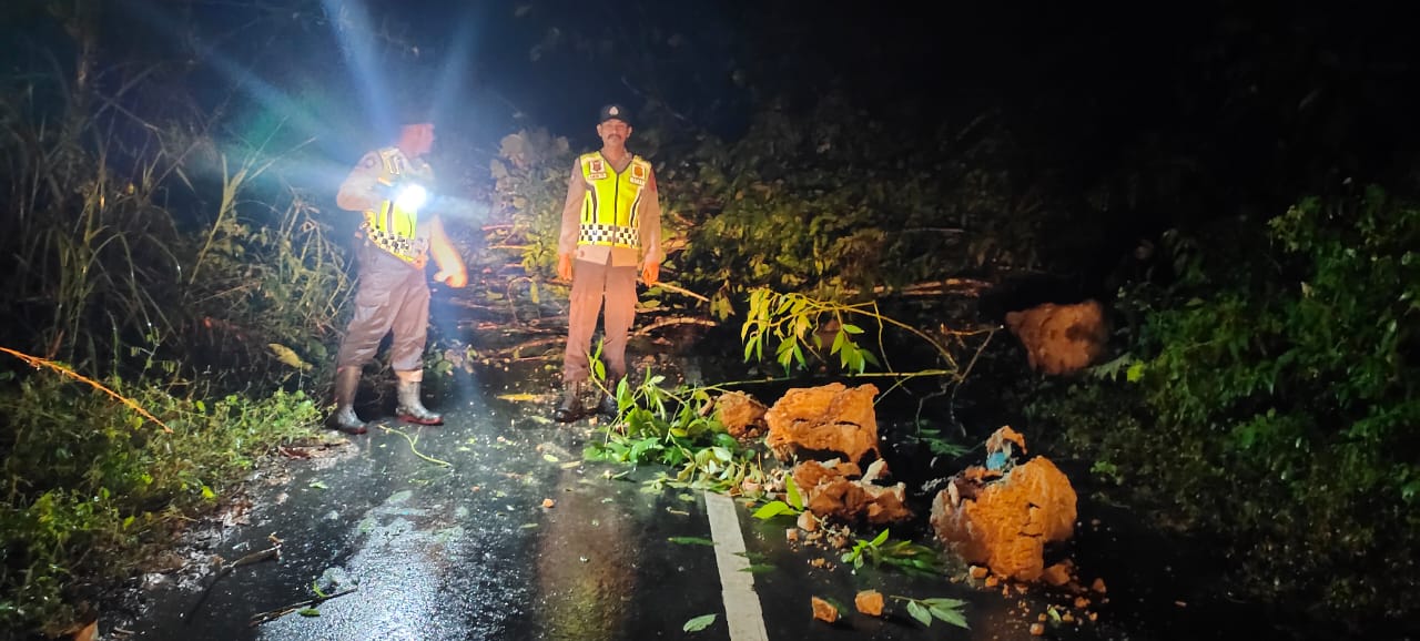Disebutkan badan jalan tertimbun material longsor sehingga tidak bisa lewati kendaraan roda empat atau lebih.