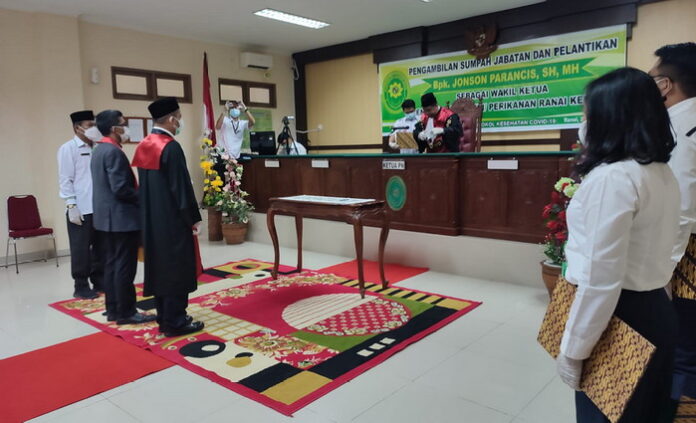 Pengambilan sumpah jabatan dan pelantikan Jonson Parancis dipimpin langsung oleh Ketua PN Daniel Ronald SH, M. Hum., di ruang sidang utama Pengadilan Negeri Kelas II Ranai, Senin (02/08).