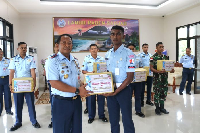 Natuna – Komandan Lanud Raden Sadjad Marsma TNI Onesmus Gede Rai Aryadi, S.E., M.M., M.Han., menyerahkan bingkisan Natal kepada personel Lanud RSA dan Skadron Udara 52 di Lobby Mako Lanud RSA, Kabupaten Natuna Provinsi Kepulauan Riau, Senin (22/12/2025).