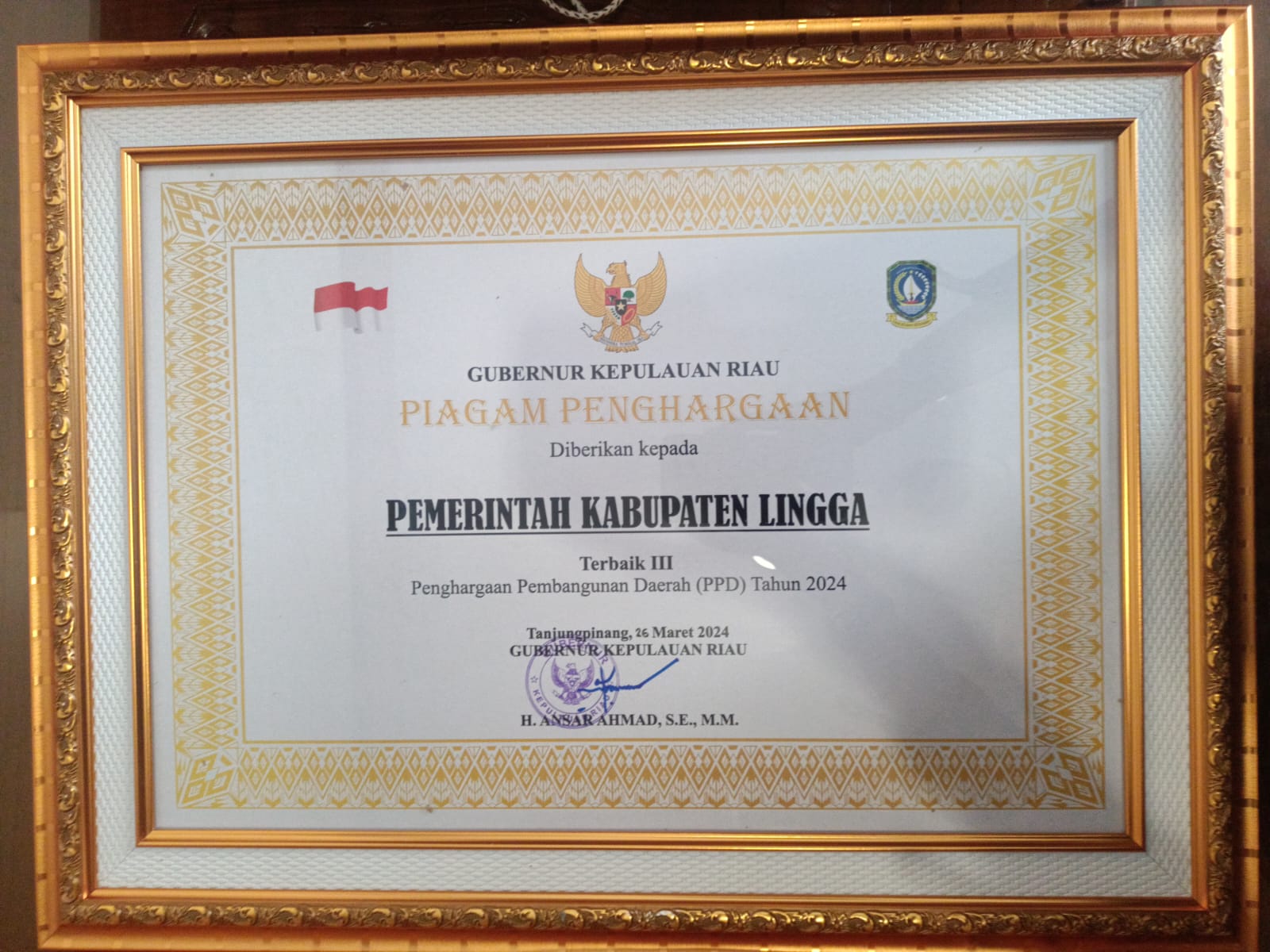 Penghargaan diserahkan langsung oleh Gubernur Kepulauan Riau kepada Bupati Lingga yang diwakili oleh Kepala Barenlitbang Kabupaten Lingga, Selamat, S.Pi., M.IP. Penghargaan diserahkan di Aula Wan Seri Beni Kantor Gubernur Kepulauan Riau pada pelaksanaan Musrenbang Tingkat Provinsi Kepulauan Riau Tahun 2024 dalam Rangka Penyusunan RKPD Provinsi Kepulauan Riau Tahun 2025.