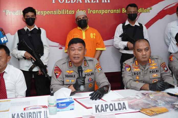 Kapolda Kepri Irjen Pol. Drs. Tabana Bangun, M.Si memimpin konferensi pers pengungkapan kasus tindak pidana narkoba jenis happy water di Lobby Utama Polda Kepri, Senin (13/3/23).
