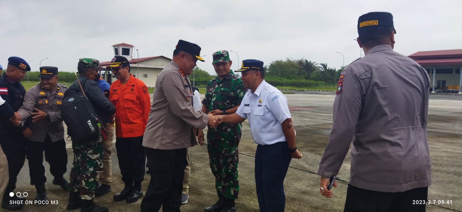 Bursakota.co.id, Natuna – Kapolda Kepulauan Riau Irjen Pol. Drs. Tabana Bangun didampingi Danrem Wira Pratama Brigjen TNi Yudi Yulistyanto, Dansat Brimob KBP M. Fhaisal Aris dan Kor Spripim Kompol Ramadhanto tiba di Bandara Raden Sajad Ranai, guna memantau dan memastikan penanganan bencana tanah longsor evakuasi korban di Pulau Serasan dapat di atasi dengan cepat, Ranai (07/03/2023).