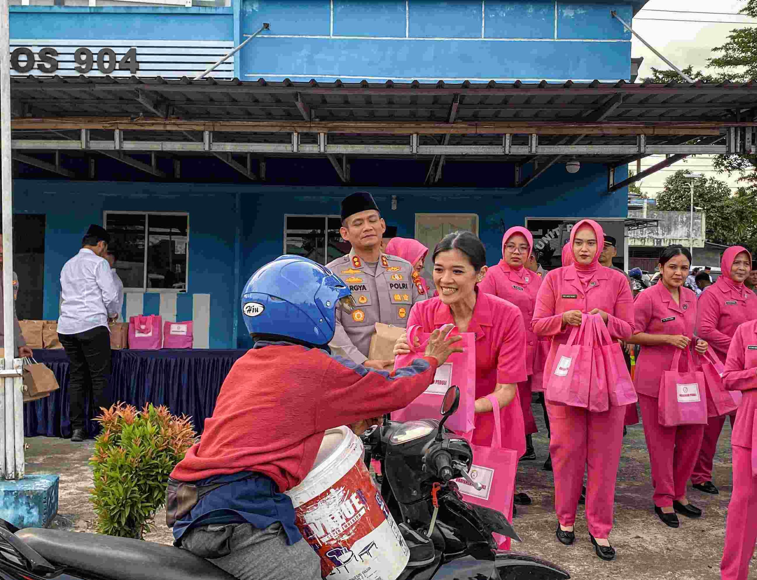 Kehadiran Bhayangkari menambah sentuhan kekeluargaan dalam kegiatan tersebut. Dengan penuh kelembutan, para pengurus Bhayangkari menyapa para ibu dan anak-anak yang melintas, memastikan setiap paket diterima dengan senyum dan kebahagiaan.