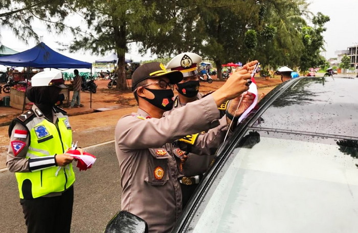 Bursakota.co.id, Natuna – Kapolres Natuna AKBP Ike Krisnadian, S.I.K., M.Si didampingi oleh Kasat Lantas Iptu Adam YS, membagikan bendera merah putih kepada pengemudi kenderaan roda dua maupun roda empat, Rabu (05/08).