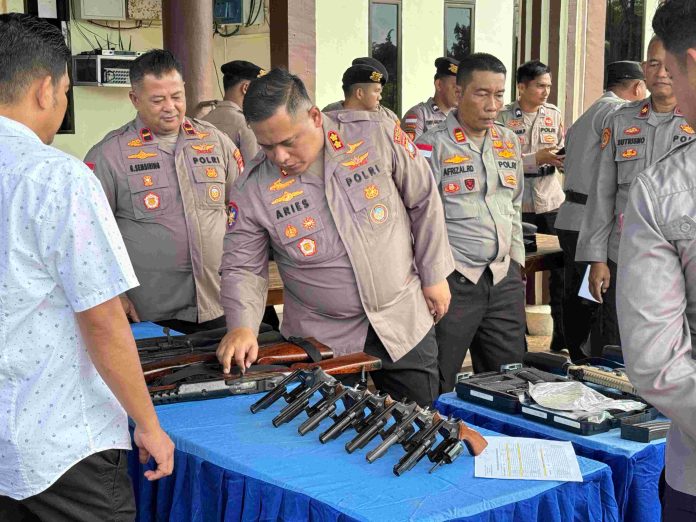 Natuna – Dalam rangka memastikan kesiapan serta kedisiplinan personel dalam penggunaan senjata api dinas, Kapolres Natuna melaksanakan kegiatan pengecekan dan pemeriksaan senjata api milik Polres Natuna. Kegiatan tersebut berlangsung di lobi Gedung Utama Polres Natuna dan dihadiri oleh para Pejabat Utama (PJU) serta personel Polres Natuna. Senin (09/03/2026)