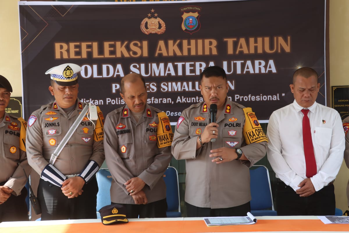 Simalungun – Polres Simalungun menggelar Refleksi Akhir Tahun dengan tema “Hadirkan Polisi Transparan, Akuntabel dan Profesional”. Pada hari Jumat, 27 Desember 2024 di halaman parkir Mako Polsek Parapat. Kegiatan ini dipimpin langsung oleh Kapolres Simalungun, AKBP Choky Sentosa Meliala, S.I.K., S.H., M.H., dan dihadiri oleh seluruh jajaran Polres Simalungun.