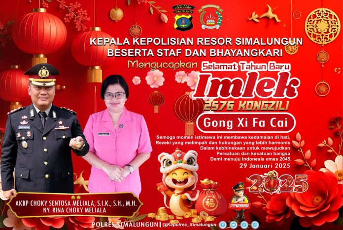 “Kapolres Simalungun AKBP Choky Sentosa Meliala beserta istri, Ny. Rina Choky Meliala, dan seluruh jajaran mengucapkan selamat Tahun Baru Imlek 2576 Kongzili, Gong Xi Fa Cai kepada seluruh masyarakat Tionghoa di wilayah hukum Polres Simalungun,” ujar AKP Verry Purba.