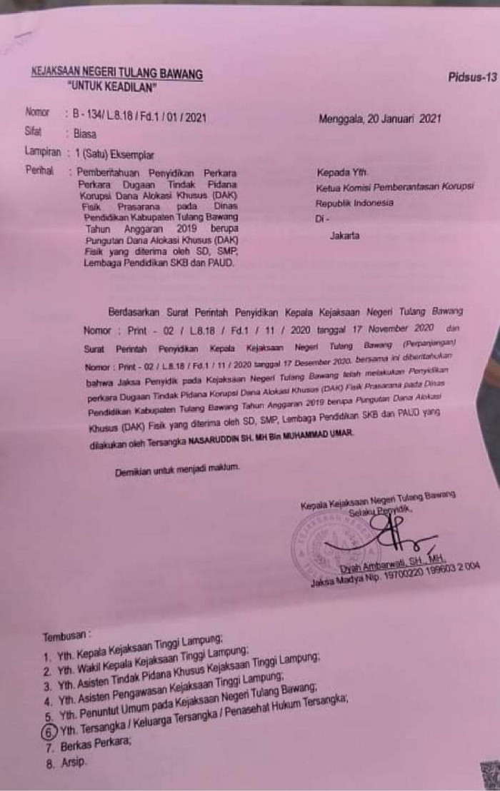 Dalam jumpa pers jam 17:12 Wib, Kajari Menggala melalui Kasi Intel Kejaksaan Negeri Menggala Raden mengatakan “hari ini kita memeriksa pejabat Tulang Bawang berinisial (N), terkait DAK Fisik tahun 2019, tentang pemotongan setoran (Fee Dak fisik T.A 2019) setiap sekolah penerima DAK SD SMP.”kata Raden.