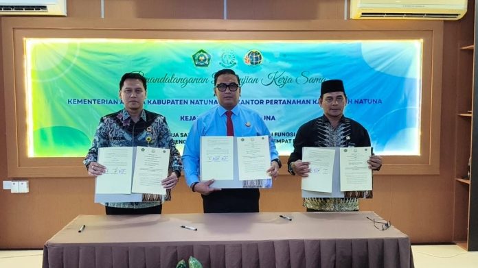 Penandatanganan dilakukan langsung oleh Kepala Kejaksaan Negeri Natuna, Erwin Indrapraja, bersama Plh. Kepala Kemenag Natuna, Muhd. Sabirin, serta Kepala Kantor Pertanahan Natuna, Amir Nugroho, di Aula Kejari Natuna.