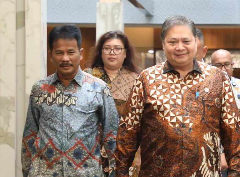 Bersama Anggota Bidang Pengelolaan Kawasan dan Investasi BP Batam, Sudirman Saad, Muhammad Rudi melaporkan perkembangan terkini kepada Menteri Koordinator Bidang Perekonomian RI, Airlangga Hartarto, dalam rapat Progres Pengembangan Kawasan Rempang Eco-City, Rabu (12/7/2023).