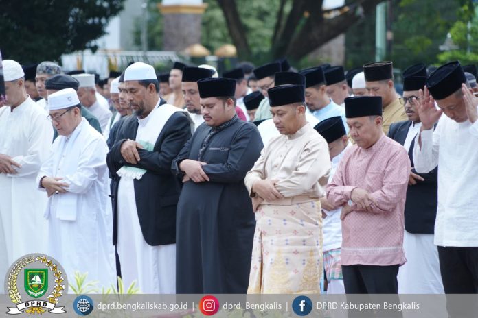 Humas DPRD – Ketua DPRD Kabupaten Bengkalis, Septian Nugraha, bersama ribuan masyarakat melaksanakan Shalat Idul Adha 1446 Hijriah/2025 Masehi di Lapangan Tugu, Bengkalis, Jumat (6/6/2025).