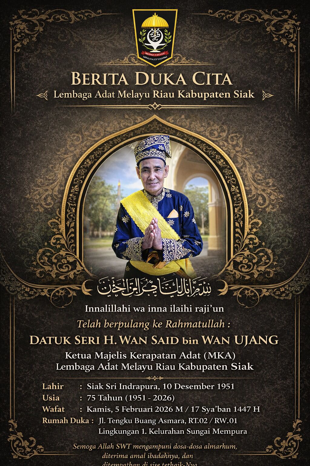 Siak – Ketua Umum (Ketum) Majelis Kerapatan Adat (MKA) Lembaga Adat Melayu Riau (LAMR) Kabupaten Siak, H. Wan Said, Kamis (5/2/2026), berpulang ke Rahmatullah. Almarhum lahir di Siak 74 tahun silam, kepergian almarhum meninggalkan duka mendalam bagi masyarakat Siak, khususnya insan adat dan pemerintahan daerah.