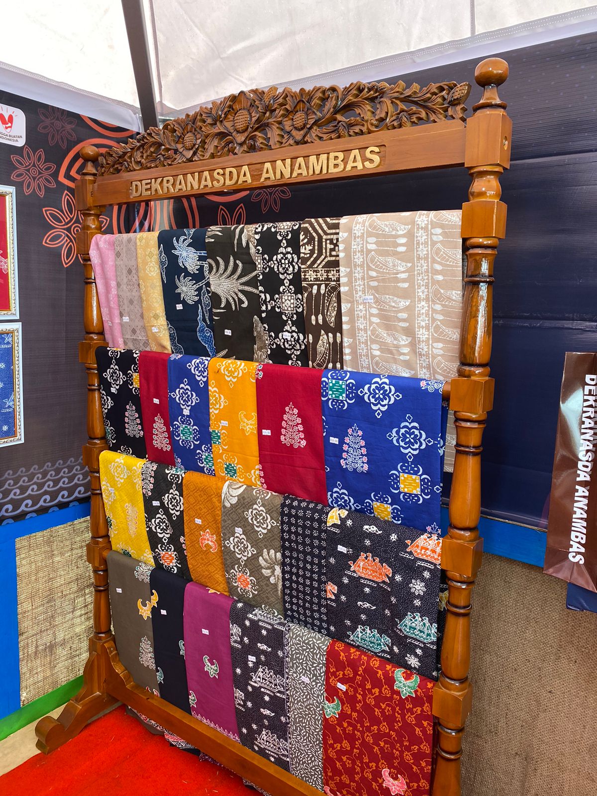 Dari kejauhan, stan Kabupaten Kepulauan Anambas ini mudah dikenali dengan pajangan kain batik warna-warni yang tersusun rapi di rak kayu berukir khas Anambas.