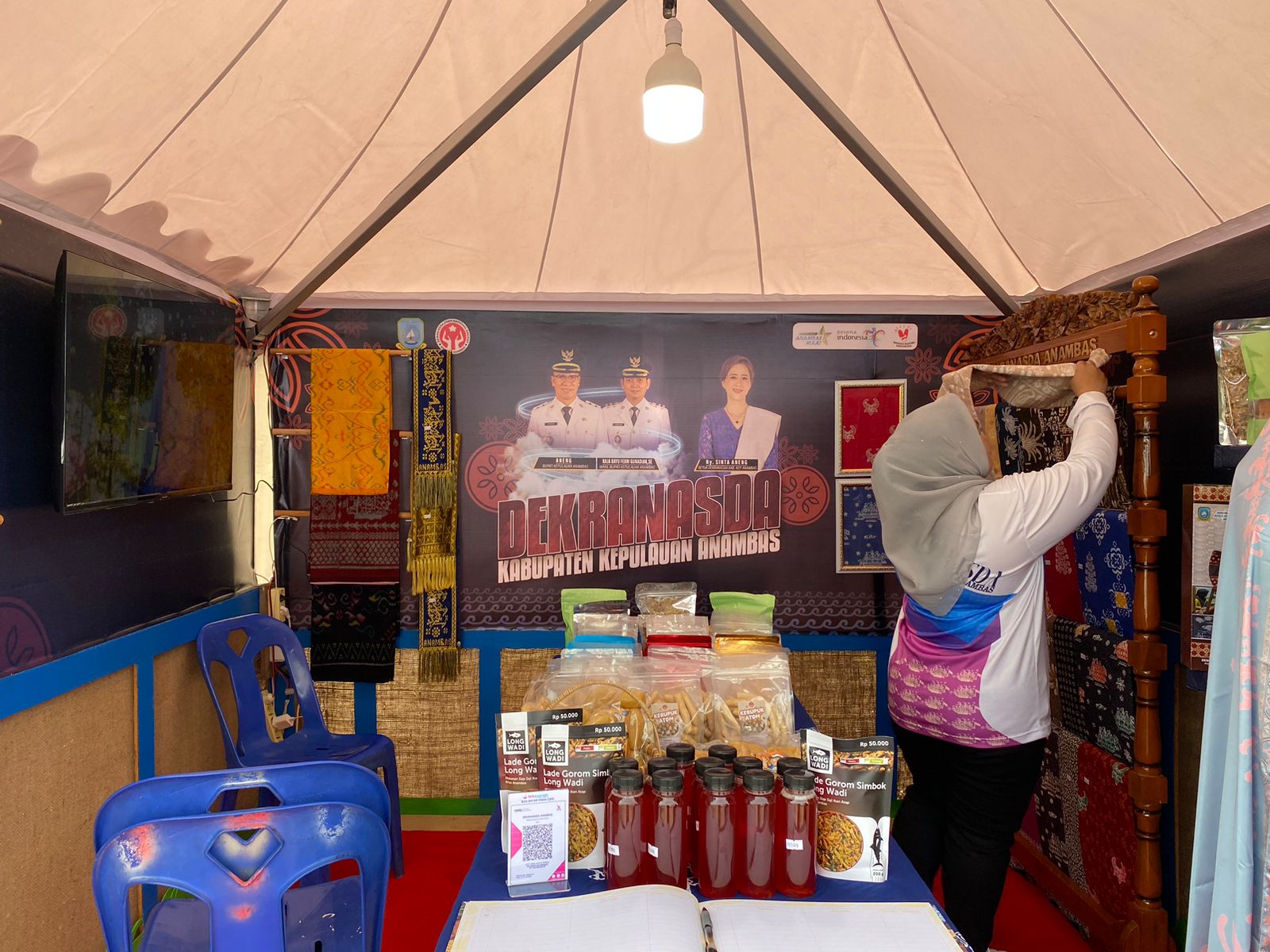 Di sisi dalam stan, tampak pula para anggota stan sibuk merapikan susunan batik di rak pajangan. Aktivitas sederhana ini justru memberi nuansa kehangatan, menggambarkan perhatian penuh pada setiap detail karya yang ditampilkan. Produk lain seperti olahan makanan lokal Anambas turut menghiasi meja, memperkaya pengalaman pengunjung yang singgah.