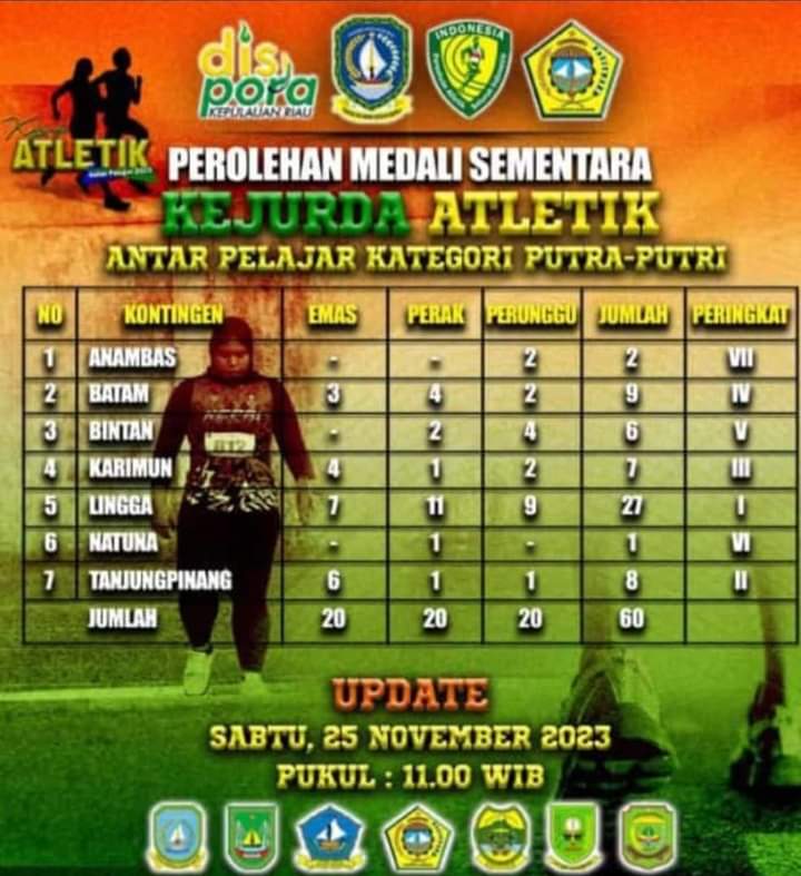 Kejurda tingkat Provinsi Kepri berlangsung dari tanggal 21 hingga 25 November di Karimun, dan prestasi gemilang telah disumbangkan oleh para atletik Pelajar dari Kabupaten Lingga.(Bk/Iwan)