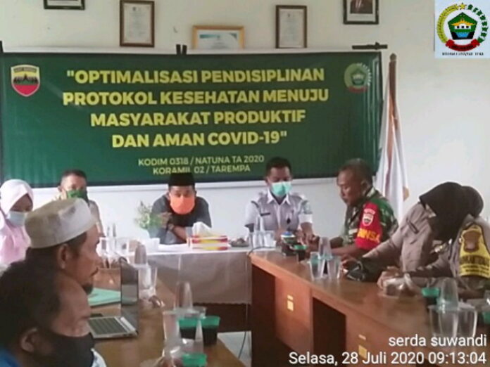 Bursakota.co.id, Tarempa Selatan – Plh Komandan Rayon Militer 02/ Tarempa Kodim 0318/Natuna Pelda Wamada Simare Mare didampingi oleh Babinsa Desa Tarempa Selatan Serka Syahdan dan para anggota Babinsa Koramil 02/ Tarempa mengikuti kegiatan seminar optimilisasi protokol kesehatan menuju masyarakat produktif dan aman dari covid 19 di aula Kantor Desa Tarempa Selatan Kecamatan Siantan Kabupaten Kepulauan Anambas (KKA), Selasa (28/07).