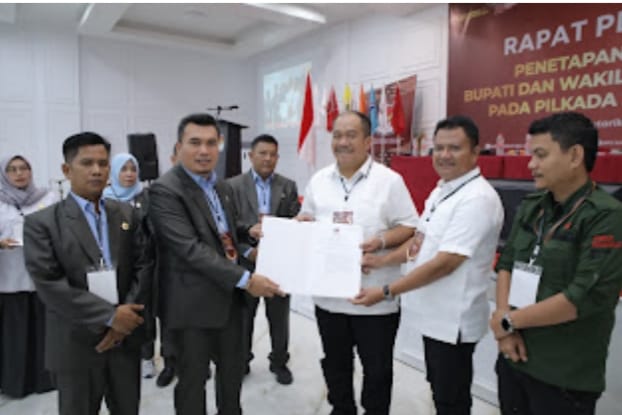 Bursakota.co.id, Asahan – Berdasarkan Surat Keputusan Komisi Pemilihan Umum Kabupaten Asahan Nomor 5 Tahun 2025 Tentang Penetapan Pasangan Calon Bupati dan Wakil Bupati Terpilih Kabupaten Asahan Tahun 2025, KPU Kabupaten Asahan menetapkan pasangan Calon Bupati dan Wakil Bupati Kabupaten Asahan Nomor Urut 1 Taufik Zainal Abidin Siregar SSos MSi dan Rianto SH MAP dengan perolehan suara sebanyak 178.671 suara atau 74,92% dari total suara sah, sebagai Pasangan Calon Bupati dan Wakil Bupati Terpilih Kabupaten Asahan Periode Tahun 2025-2030 dalam Pemilihan Bupati dan Wakil Bupati Kabupaten Asahan Tahun 2024.