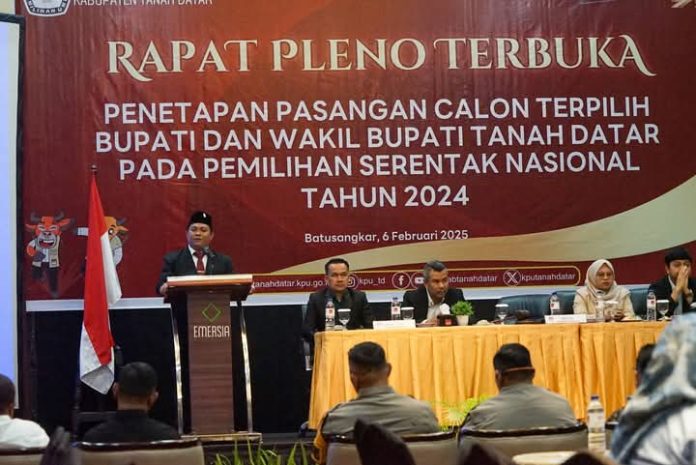 Bursakota.co.id, Tanah Datar – Komisi Pemilihan Umum (KPU) Kabupaten Tanah Datar menggelar Rapat Pleno Terbuka Penetapan Pasangan Calon (Paslon) Terpilih Bupati dan Wakil Bupati Tanah Datar pada Pemilihan Serentak Nasional Tahun 2024, di Emersia Hotel Batusangkar, Kamis (6/2/2025) malam.