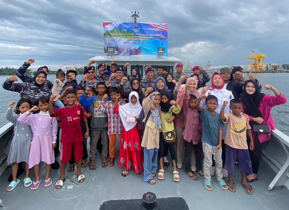 Keceriaan terpancar jelas di wajah lugu anak-anak yang naik dan ikut berlayar mengunakan kapal patroli laut milik TNI AL Lhokseumawe, yang biasanya mereka hanya melihat dari kejauhan atau dari televisi.