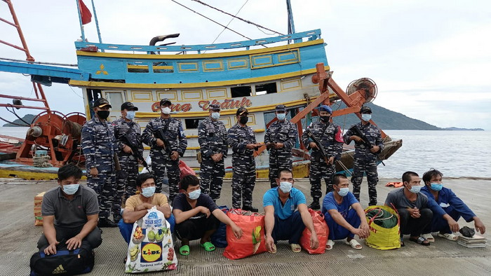 “Sebelum kita bawa ke Lanal Ranai tentunya seluruh Anak Buah Kapal (ABK) terlebih dahulu kita cek kesehatannya dan kita lakukan tes antigen oleh tim scrining Puskesmas Pulau Tiga Barat, serta barang bawaannya kita semprot dengan cairan disinfektan. Protokol kesehatan Covid -19 wajib kita laksanakan,”terangnya.