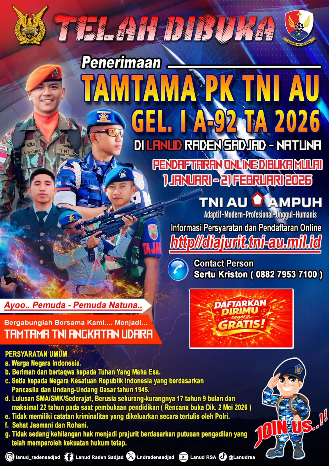 Kesempatan ini terbuka bagi para pemuda terbaik Natuna yang memiliki semangat pengabdian, disiplin tinggi, serta tekad kuat untuk menjaga kedaulatan udara Negara Kesatuan Republik Indonesia.