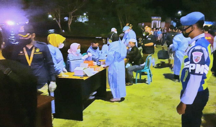 Setelah pelaksanaan apel, personel Satpomau dan Gabungan personel TNI-Polri melakukan pengetatan dan pengecekan serta sosialisasi agar mematuhi protokol kesehatan terhadap penumpang kapal motor laut di pelantar pelabuhan Selat Lampa Natuna.