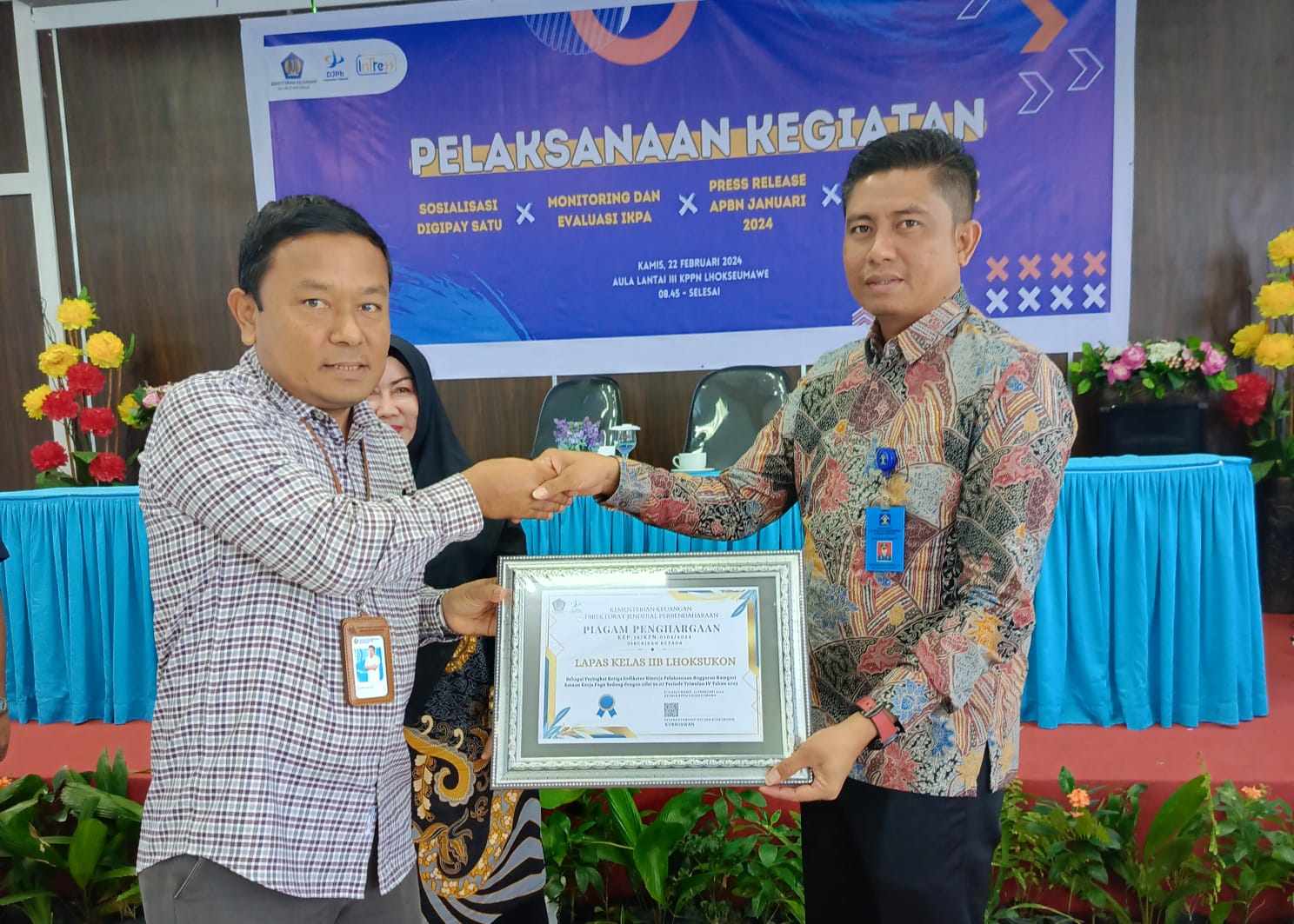 Bursakota.co.id. Lhokseumawe – Lembaga Pemasyarakatan (Lapas) Kelas IIB Lhoksukon berhasil meraih penghargaan dari Kantor Pelayanan Perbendaharaan Negara (KPPN) Lhokseumawe sebagai peringkat ketiga indikator kinerja pelaksanaan anggaran kategori satuan kerja pagu dengan nilai 99,07 periode triwulan IV tahun 2023.