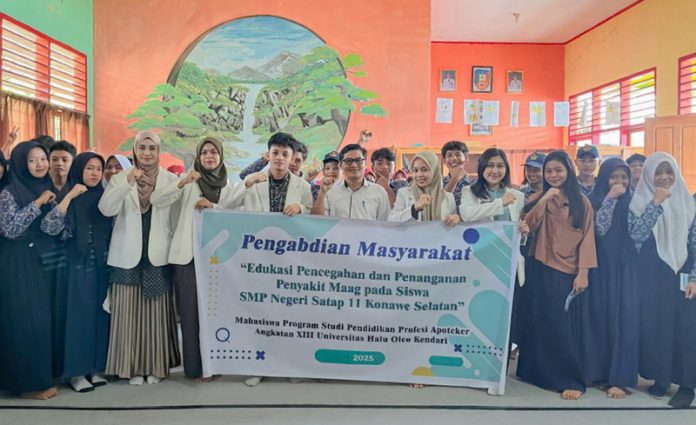 Konawe Selatan – Sebagai wujud nyata pengabdian kepada masyarakat, mahasiswa Pendidikan Profesi Apoteker, Fakultas FARMASI Universitas Halu Oleo (UHO) menggelar kegiatan edukasi kesehatan dengan tema PENCEGAHAN DAN PENANGANAN PENYAKIT MAAG, yang dilaksanakan pada hari Rabu tanggal 04 Juni 2025 di SMP Negeri SATAP 11 Kabupaten Konawe Selatan.