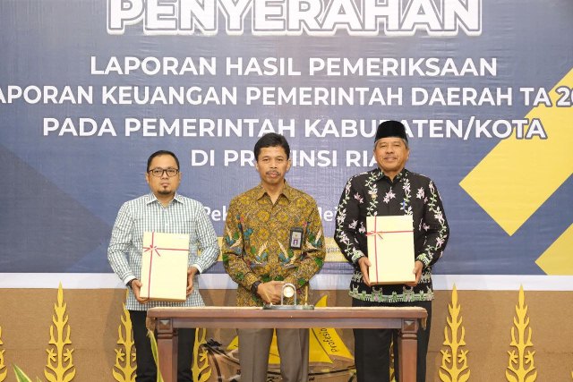 “Bapak dan ibu sekalian, hari ini saya menyerahkan laporan keuangan kepada bapak ibu dengan opini WTP. Insya Allah ini sudah sekian kalinya dan alhamdulillah membuat bahagia, karena sebelum diserahkan sudah tahu yakin akan WTP yang artinya bahwa pengelolaan keuangan di lingkungan bapak ibu sekalian sangat baik,” ucap Kepala Perwakilan BPK RI Perwakilan Provinsi Riau tersebut.