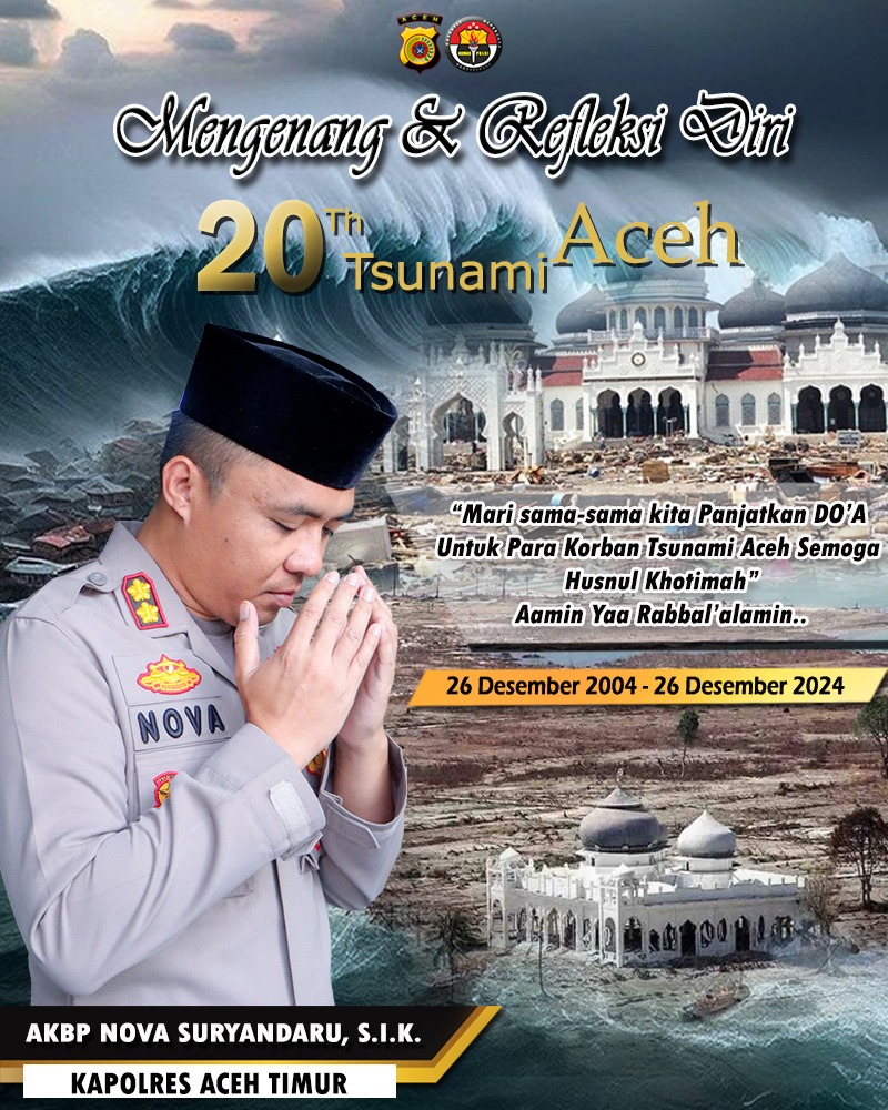 “Selama 3 (tiga) menit bunyi sirine, mari kita bersama-sama berdo’a, mengenang saudara-saudara kita yang menjadi korban tsunami Aceh pada 20 tahun silam,” sebut Kasat Lantas Polres Aceh Timur, Polda Aceh, Iptu Eko Suhendro, S.H. Rabu, (25/12/2024) malam.