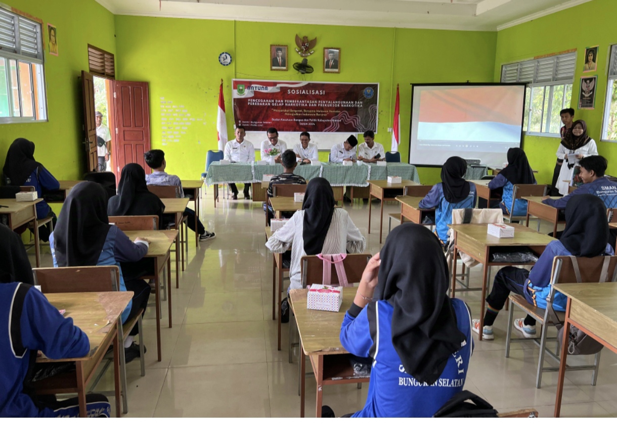 Bursakota.co.id, Natuna – Badan Kesatuan Bangsa dan Politik (Bakesbangpol) Kabupaten Natuna menggelar kegiatan sosialisasi pencegahan dan pemberantasan penyalahgunaan narkotika di SMAN 1 Bunguran Selatan. Rabu (30/10/2024).