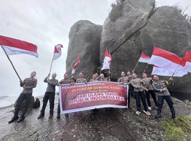 Dipimpin AKP Afrizal sebagai Komandan Regu, 15 personel Polres Natuna menaklukkan jalur terjal penuh tantangan demi membawa Sang Saka Merah Putih ke titik tertinggi di Natuna.