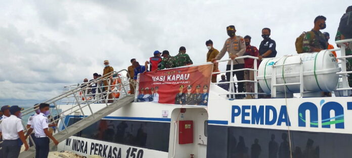 Kapolres Natuna AKBP Ike Krisnadian S.I.K., M.Si Bersama Bupati Natuna dan Gabungan Para Komandan Satuan TNI, serta anggota DPRD Kabupaten Natuna bergerak menuju Kecamatan Pulau Laut Menggunakan Kapal Ferry Indra Perkasa 159 dalam rangka Pelaksanaan Program Kapolda Kepri Percepatan Vaksinasi dengan Kegiatan NASI KAPAU ( Vaksinasi Jangkau Pulau ), Perjalanan selama 3 jam menuju Kecamatan Pulau Laut.