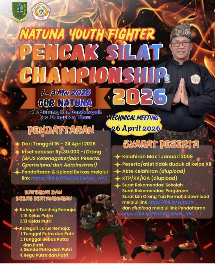 Natuna – Ajang pencarian dan pembinaan atlet pencak silat muda akan segera digelar melalui Natuna Youth Fighter IPSI Cup 2026 yang akan berlangsung pada 1 hingga 3 Mei 2026 di GOR Air Mulung, Kelurahan Bandarsyah, Kecamatan Bunguran Timur.