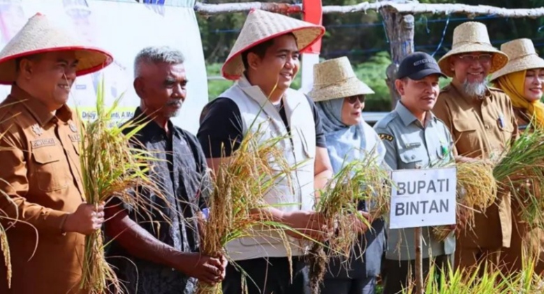 Bintan – Dengan penuh semangat, Bupati Bintan Roby Kurniawan didampingi Sekretaris Daerah Kabupaten Bintan Ronny Kartika melaksanakan panen perdana padi gogo, hasil terobosan petani lokal yang tergabung dalam Kelompok Tani (Poktan) Maju Jaya, Kampung Sei Jeram, Desa Lancang Kuning, Kecamatan Bintan Utara, Senin (26/1/2026).