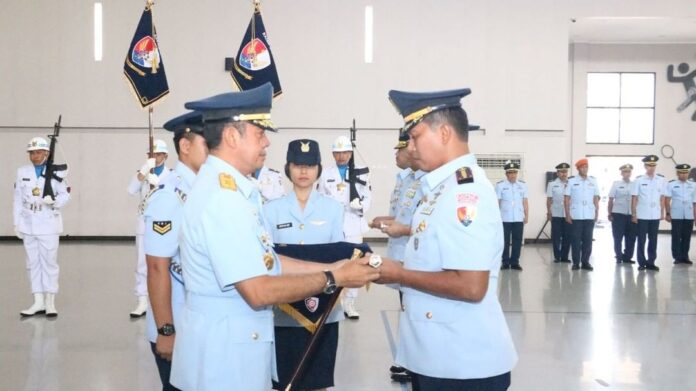 Foto : Panglima Komando Operasi Udara I (Pangkoopsud I) Marsda TNI Bambang Gunarto, S.T., M.M., M.Sc., memimpin langsung upacara serah terima jabatan Komandan Pangkalan TNI AU(Danlanud) Raden Sadjad(RSA) Ranai Natuna, Provinsi Kepri dari Kolonel Pnb Jajang Setiawan, S.M., M.Han., PSC(J)., Kepada Kolonel Pnb Dedy Iskandar, S.Sos., M.M.S., M.Han., di GOR Antarikshe Makoopsud I, Jakarta, Rabu (5/7/2023).