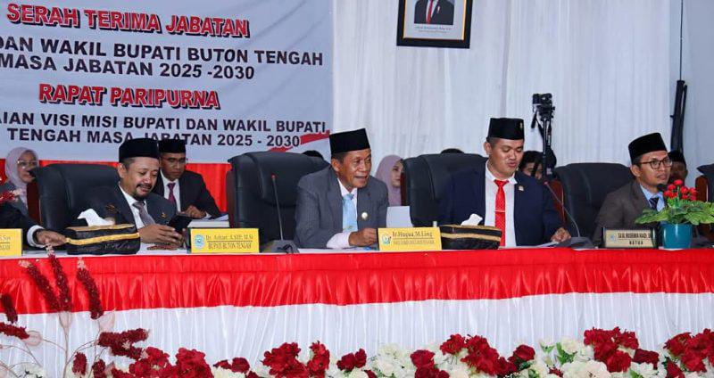 Bursakota.co.id, Buton Tengah – Dewan Perwakilan Rakyat Daerah (DPRD) Kabupaten Buton Tengah Sulawesi Tenggara (Sultra) menggelar Rapat Paripurna Serah Terima Jabatan (Sertijab) dari Penjabat (Pj) Bupati H.Konstatinus Bukide kepada Bupati terpilih periode 2025-2030 Dr.Azhari,S.STP.,M.Si dan Muh Adam Basan di Aula kantor DPRD Buton Tengah.
