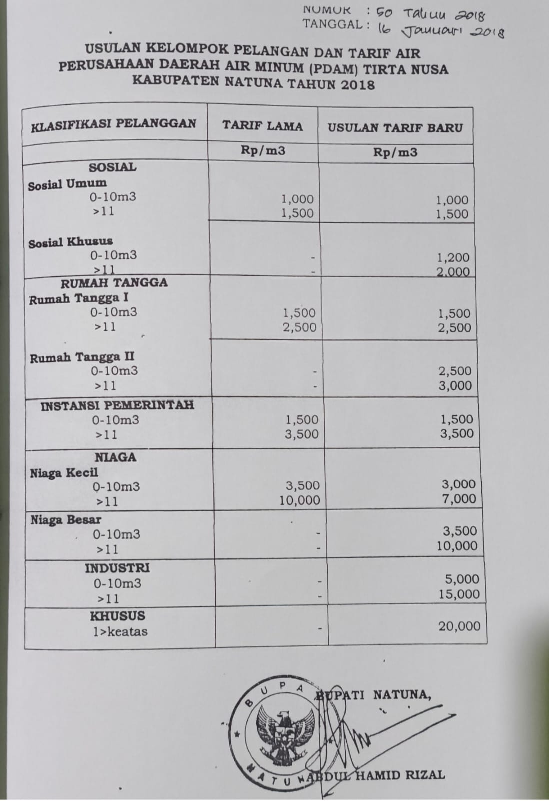 Usulan kelompok pelanggan dan tarif air perusahaan daerah air minum (pdam) tirta nusa natuna