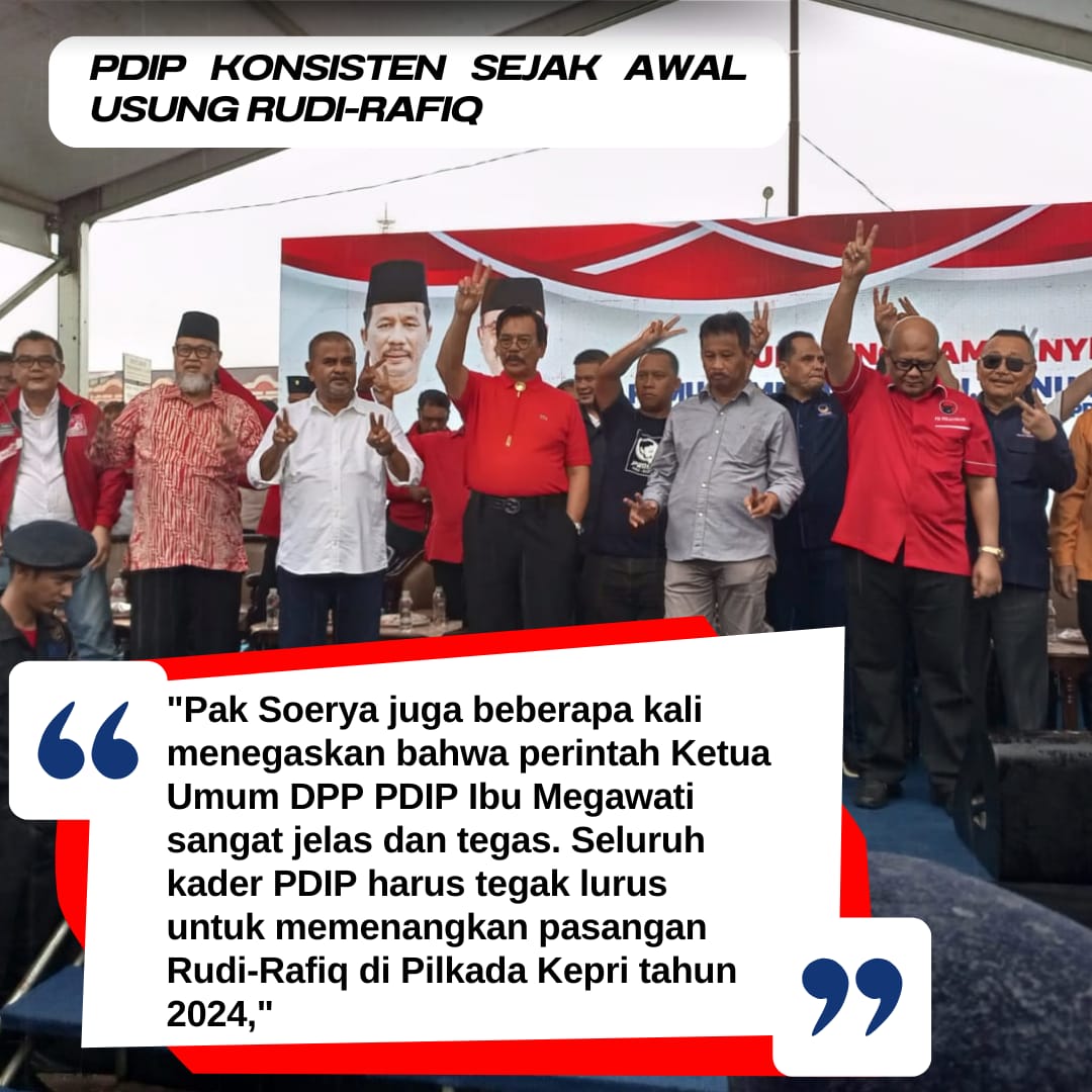 Karena sejak awal, bahkan sebelum keluar keputusan Mahkamah Konstitusi (MK) Nomor 60 Tahun 2024 tentang treshold pencalonan pilkada, PDIP telah berkomitmen mengusung Rudi-Rafiq bersama Partai Nasdem. Partai lain, PSI bergabung kemudian dan ketiga partai telah didaftarkan sebagai pengusung ke KPUD Kepri tanggal 28 Agustus 2024.