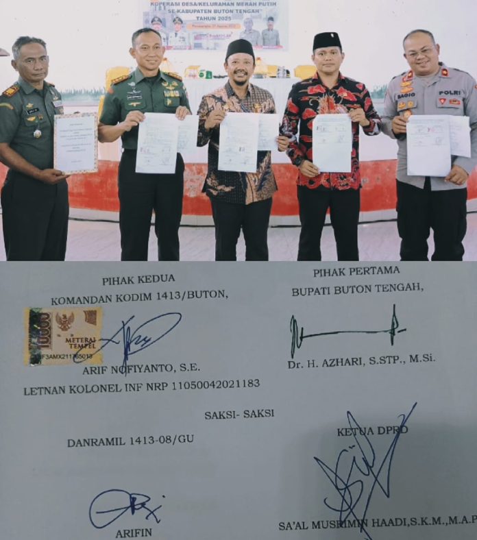 Naskah perjanjian hibah daerah tersebut secara resmi di tandatangani oleh Bupati Buton Tengah Dr Azhari bersama Komandan Kodim 1413 Buton Arif Nofianto di saksikan oleh ketua DPRD Buton Tengah Sa’al Musrimin Haadi bersama Danramil 1413-08 Gu Arifin dalam kegiatan rapat tindaklanjut Koperasi desa/kelurahan merah putih di gedung kesenian Mawasangka, Pada hari Kamis, 07/08/2025.