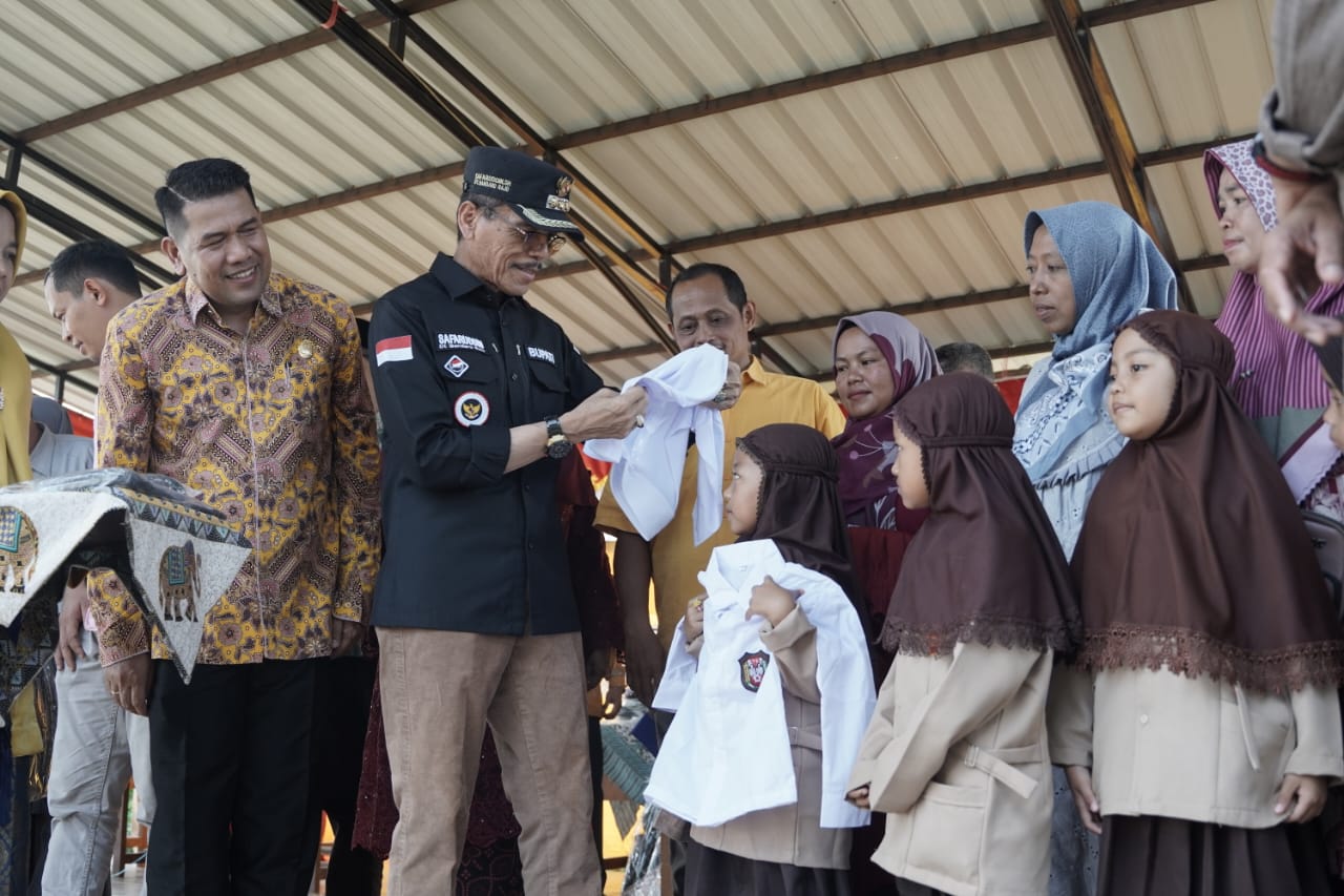 Menurut bupati, penyerahan perlengkapan sekolah untuk siswa kelas 1 SD dan kelas 7 SMP yang terdiri dari baju, celana, tas, topi, ikat pinggang dan dasi secara gratis ini adalah bukti komitmen Pemerintah Daerah (Pemda) terhadap segala program yang telah dijanjikan kepada masyarakat.