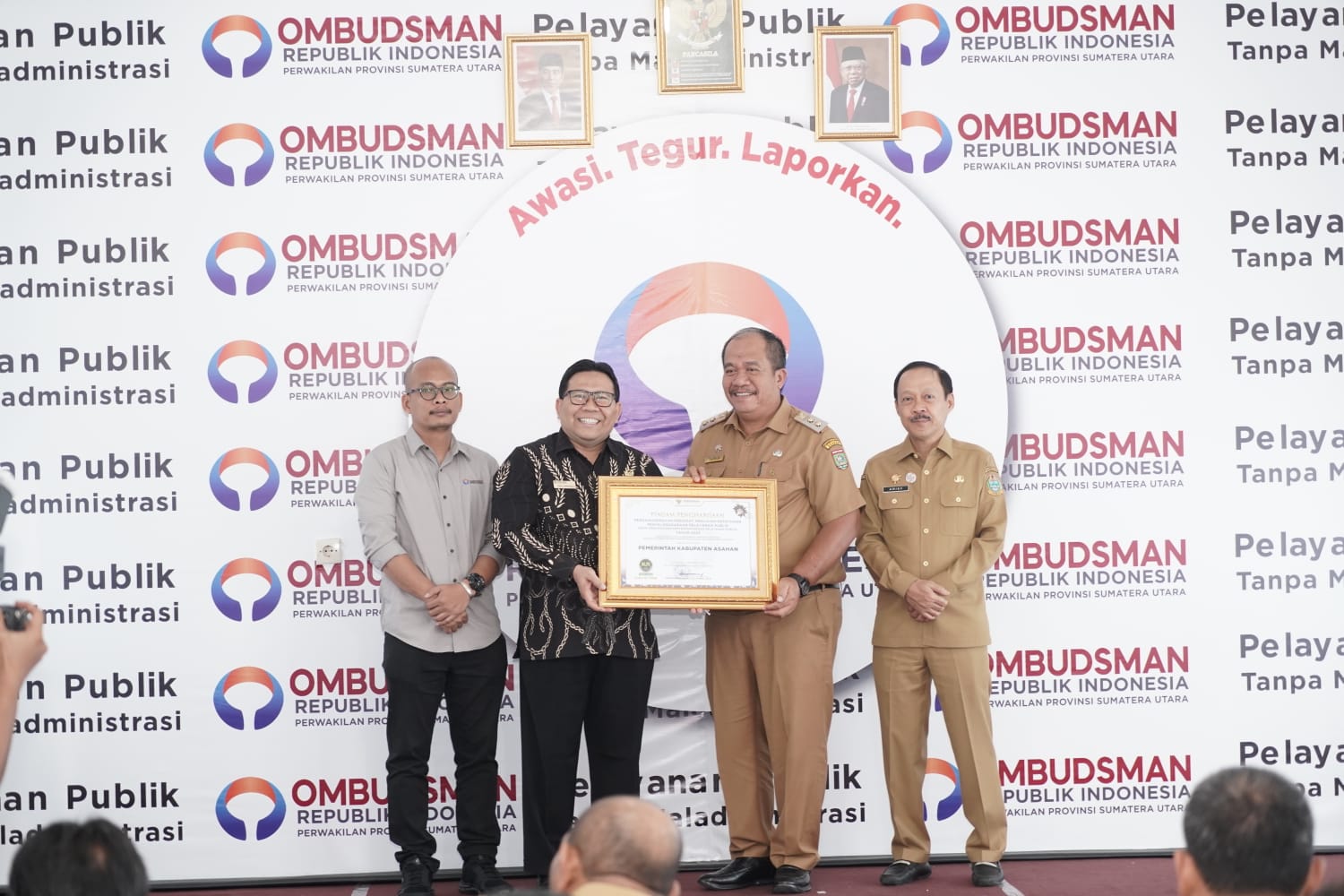 Bursakota.co.id, Asahan – Pemerintah Kabupaten Asahan yang diwakili oleh Wakil Bupati Asahan Taufik Zainal Abidin, S.Sos, M.Si menerima Piagam penghargaan yang diserahkan langsung Anggota Ombudsman Republik Indonesia (RI) Dadan Suparjo Suharmawijaya, Selasa (23/01/2024). Bertempat di Kantor Ombudsman RI Perwakilan Sumut, Jalan Asrama No 18 Medan
