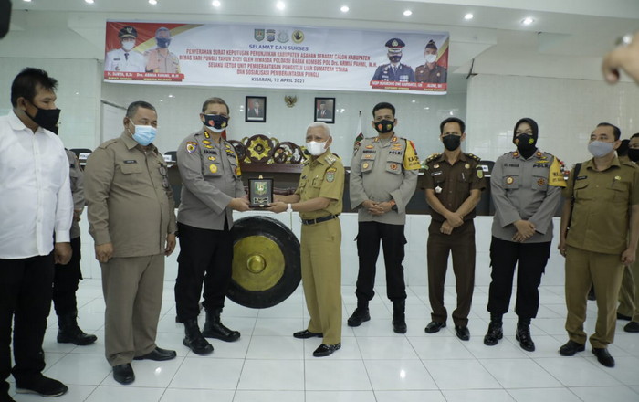 Bursakota.co.id, Asahan – Bertempat di Aula Melati Kantor Bupati Asahan, Pemerintah Kabupaten Asahan terima penyerahan surat keputusan penunjukan Kabupaten Asahan sebagai calon Kabupaten bebas dari pungli tahun 2021 oleh Irwasda Poldasu, Kombes Pol Drs. Armia Fahmi, M.H selaku ketua unit pemberantasan pungutan liar Sumatera Utara dan sosialisasi pemberantasan pungli, Senin (12/04/2021)