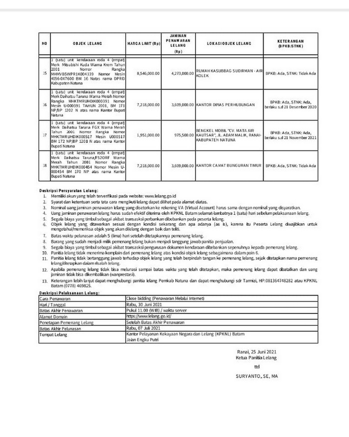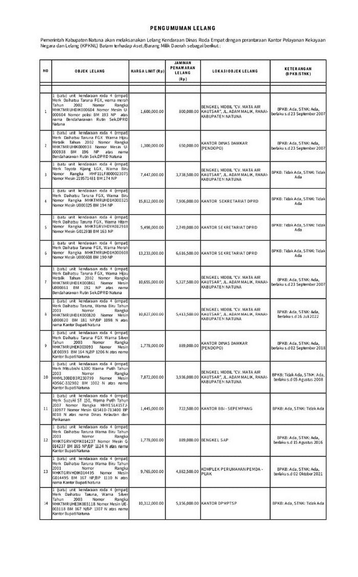 Bursakota.co.id, Natuna – Pemerintah Kabupaten (Pemkab) Natuna akan melakukan lelang kendaraan roda empat atau mobil pada Juli mendatang.
